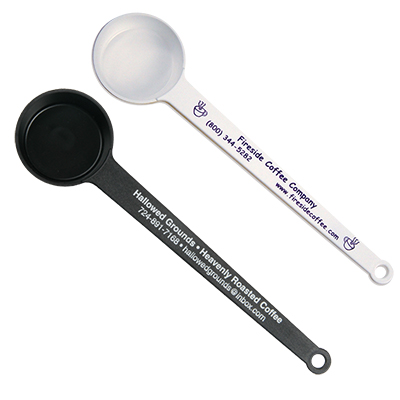 Custom Printed Coffee Scoops. Almost every kitchen and every office makes coffee. Excellent Name Recognition promotional tool. Leaves very positive inmpression over long period of time. FDA compliant. 4 tsp. measurement. and is Made in USA