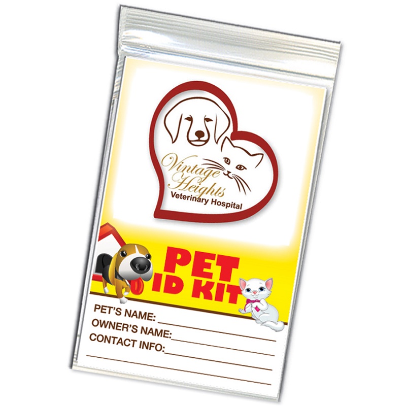 Each Pet Indentification Kit includes an area to list a pet's characteristics, medical history, photo and more. Thoughtful promotional product to help keep pets safe with their information listed in this ID Kit in the unfortunate event of a missing or ill pet.
