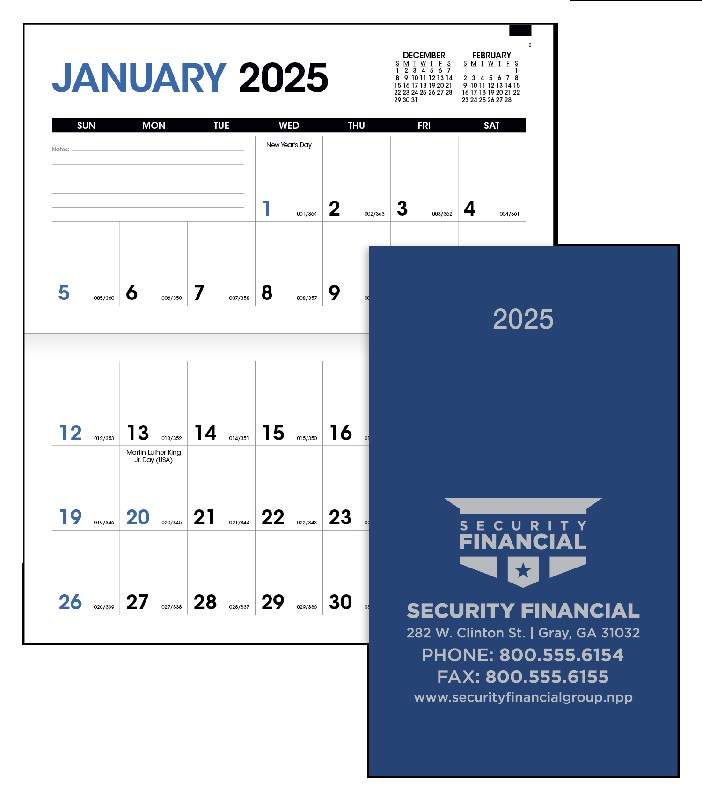 A practical, affordable date book. Perfect for large-scale distribution and direct mail. The horizontal date pad format shows a full month on each two-page spread.