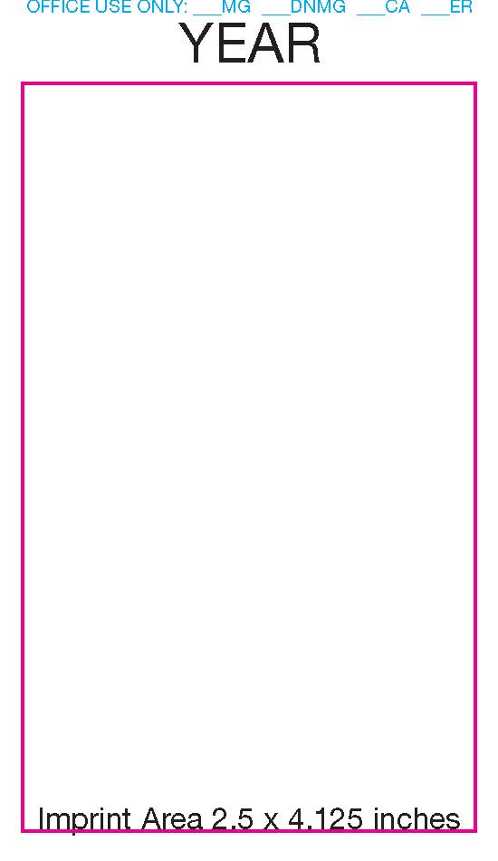 Imprint Area: Foil Stamp Outside Front Cover 2-1/2" w x 4-1/8" h 1 color included standard. Optional Foil Stamp Outside Back Cover 2-1/2" w x 4-1/8" h, contact us for additional charges.