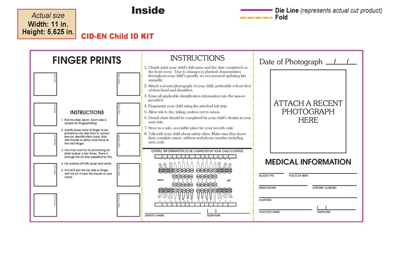 Child Identification Kit includes medical information card, pre-inked finger print strip, area for photo, dentist chart, personal information, DNA sample, medical and physical information along with your custom imprint on the front. Individually packaged in plastic zip top poly bag. Ideal for day care centers, schools, police and fire departments, health and medical businesses, government. agencies, libraries, churches and banks.